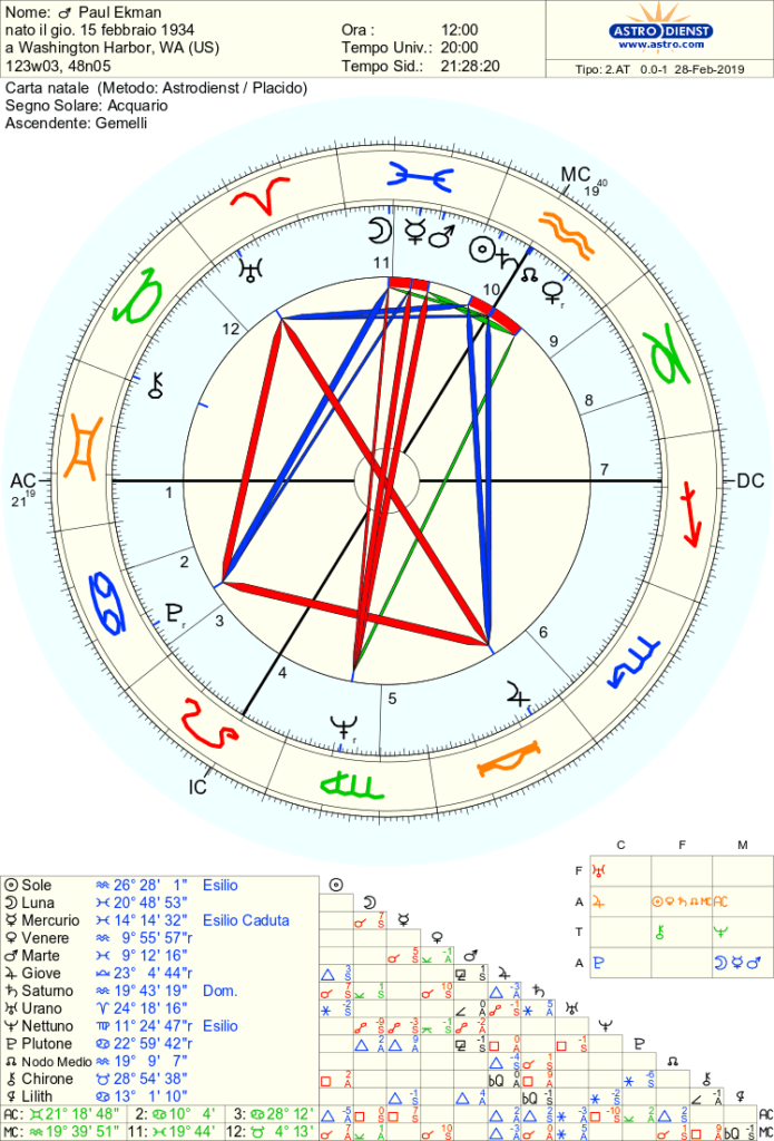 Purtroppo l'orario di nascita di Paul Ekman non è di pubblico dominio; a mio avviso si possono comunque trarre delle indicazioni importanti sulla sua mission osservando le posizioni dei pianeti nei segni, i loro dispositori, e gli aspetti che formano.