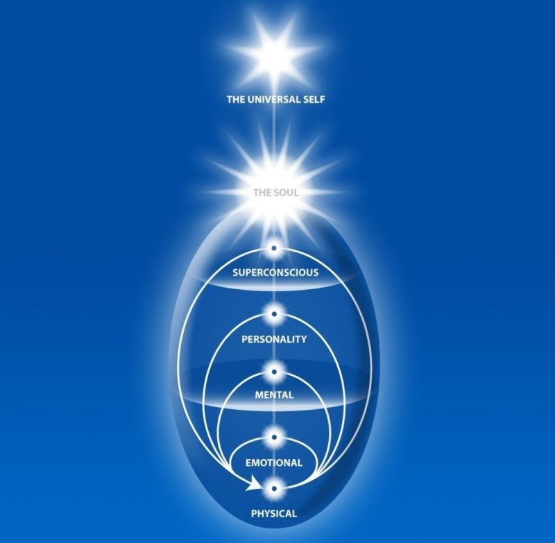 Per rappresentare simbolicamente la psiche e i suoi distretti Assagioli faceva riferimento ad un “mandala” chiamato ovoide, un grafico a forma di uovo al cui centro è raffigurato l'Io (o Sé) cosciente, circondato dal campo di consapevolezza e dall'inconscio medio; verso il basso viene rappresentato l'inconscio inferiore, e verso l'alto l'inconscio superiore (o supercosciente); in cima all'uovo si trova l'Io (o Sé) superiore o supercosciente; all'esterno dell'uovo troviamo l'inconscio collettivo. La rappresentazione dell'ovoide restituisce un'idea della vastità delle aree inconsce della psiche, i cui contenuti vanno oltre l'area di consapevolezza. Le impressioni e i vissuti dell'inconscio sono dinamici, tendono ad associarsi e a modificarsi nel tempo. Vi è una continua osmosi, un continuo scambio di informazioni dall'inconscio verso il conscio, per questo le linee che separano i vari distretti sono tratteggiate.L'inconscio inferiore (nominato inconscio profondo in questo grafico) è alla base della struttura psicologica e comprende gli istinti e le pulsioni fondamentali, i processi che regolano il sistema neurovegetativo, i complessi, i traumi, le attività immaginative e fantastiche a livello elementare, e le facoltà parapsicologiche a livello elementare. Tramite l'impiego di tecniche opportune (lo studio dei sogni, le visualizzazioni, le associazioni libere, il disegno spontaneo...ecc) è possibile far emergere i contenuti che frenano o annullano le energie vitali e che quindi possono essere le radici e le cause di disturbi psicologici e psichiatrici. L'inconscio medio contiene elementi di natura analoga a quelli che hanno accesso alla consapevolezza di veglia, di cui non è necessario essere costantemente consapevoli (per ragioni di economia cognitiva), ma che riaffiorano con facilità se si riflette per richiamarli. In quest'area della psiche avviene una costante gestazione psichica degli elementi che riaffiorano nell'area della consapevolezza durante i processi immaginativi e di pensiero. Il materiale contenuto in questo distretto, trascorso un certo tempo, possono affluire nell'inconscio inferiore, è anche possibile una mobilità di contenuti in senso inverso, in risposta ad eventi significativi, o in seguito a lavori psicoterapici o di autoindagine. L'inconscio superiore (anche chiamato superconscio o inconscio transpersonale) è la parte più “animica-evolutiva” della psiche, può essere pensato come una sorta di serbatoio delle potenzialità e dei talenti non ancora espressi dalla persona; qui l'energia del Sé viene accolta e trasformata in simboli, immagini e pensieri. Le qualità racchiuse in queste aree sono considerate dalla psicosintesi come entità viventi vibranti che devono essere esplorate solo se la personalità è sufficientemente equilibrata ed integrata, altrimenti possono essere disorientanti ed avere un effetto squilibrante. L'inconscio collettivo è lo strato più profondo dell'inconscio, una sorta di scatola nera universale che contiene il patrimonio dei vissuti dell'umanità, dall'alba dei tempi fino ad oggi, e lo trasmette per filtrazione ai singoli individui, che non essendo monadi, entrano in un rapporto di scambio energetico con l'ambiente in cui sono immersi. L'inconscio collettivo può essere scomposto in tre livelli: inferiore, medio e superiore, a seconda del tipo di contenuti, che possono essere di tipo istintuale, valoriale, immaginativo, emotivo e mentale. I contenuti energetici dell'inconscio collettivo sono “archiviati” sotto forma di archetipi: immagini simboliche preesistenti (nel senso che preesistono gli individui) che rappresentano il patrimonio delle esperienze umane narrate nei miti di tutte le culture, che possono essere plasmate da vissuti personali. I confini che separano l'inconscio personale dall'inconscio collettivo possono essere più o meno attenuati (graficamente questo riflette il tratteggio che definisce il perimetro dell'ovoide), ai due estremi possiamo avere: da una parte i soggetti corazzati che mettono una forte barriera a presidio del personale fino ad impedirne l'accesso costruendosi una sorta di scafandro; all'estremo opposto si collocano quei soggetti che hanno confini troppo labili e non sanno discriminare tra i propri contenuti psichici e quelli di altri che contattano attraverso l'inconscio collettivo. Il campo di consapevolezza (anche chiamato campo di coscienza) può essere raffigurato come lo schermo su cui vengono proiettati sovrapponendosi i contenuti della psiche di cui si è consapevoli nel qui ed ora, siano essi pensieri, immagini, affetti, istinti... ecc. L'area di questo territorio può essere più o meno vasta in funzione della quantità di elementi a cui si presta attenzione. Per conoscersi, crescere, evolvere è necessario allargare i contenuti del campo di consapevolezza introducendo contenuti dell'inconscio inferiore, medio e superiore, in modo da poterli illuminare tramite la luce della coscienza integrandoli costruttivamente nel proprio progetto esistenziale. Tornando allo schema dell'ovoide, una linea tratteggiata partendo dal centro unisce i due centri di coscienza, l'Io e il Sé, ma in realtà la dualità della coscienza è solo apparente, infatti l'Io è della stessa natura del Sé, può essere considerato un suo riflesso, una sua emanazione calata nella dimensione spazio-temporale della vita terrena. La psicosintesi si fonda sull'ipotesi del Sé, un concetto analogo a quello di anima, una forma di coscienza a priori che pervade il soggetto e la sua personalità, qualunque sia il suo livello evolutivo, e lo induce a procedere su una traiettoria di sviluppo individuale anche se l'Io ne è all'oscuro e lo può contrastare. Il Sé rappresenta il nucleo universale della finitezza individuale, per questa ragione è per metà dentro e per metà fuori rispetto all'ovoide, e costituisce una sorta di ponte tra gli aspetti universali e personali dell'individuo. Il punto di arrivo di un perc