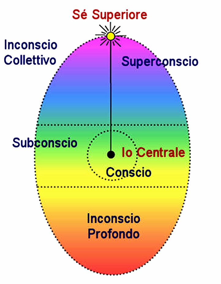 Tornando allo schema dell’ovoide, una linea tratteggiata partendo dal centro unisce i due centri di coscienza, l’Io e il Sé, ma in realtà la dualità della coscienza è solo apparente, infatti l’Io è della stessa natura del Sé, può essere considerato un suo riflesso, una sua emanazione calata nella dimensione spazio-temporale della vita terrena. La psicosintesi si fonda sull’ipotesi del Sé, un concetto analogo a quello di anima, una forma di coscienza a priori che pervade il soggetto e la sua personalità, qualunque sia il suo livello evolutivo, e lo induce a procedere su una traiettoria di sviluppo individuale anche se l’Io ne è all’oscuro e lo può contrastare. Il Sé rappresenta il nucleo universale della finitezza individuale, per questa ragione è per metà dentro e per metà fuori rispetto all’ovoide, e costituisce una sorta di ponte tra gli aspetti universali e personali dell’individuo.